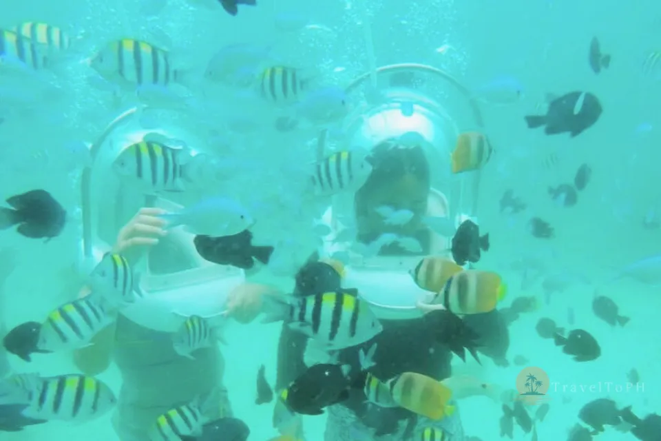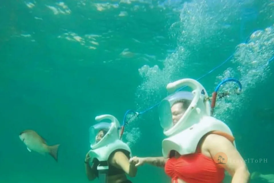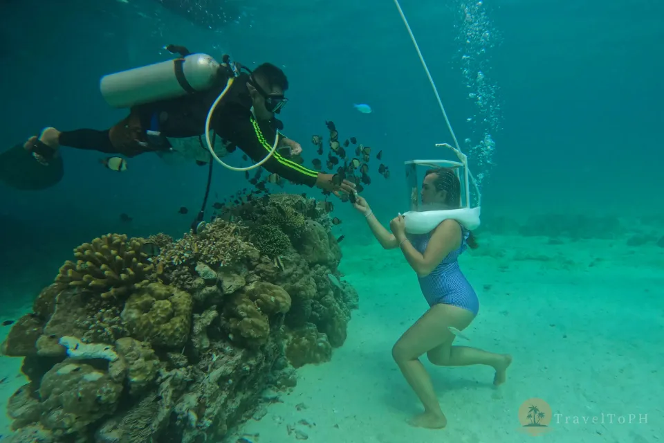 Вас заберут из отеля на Боракае и доставят к месту проведения дайвинга. После инструктажа и подготовки вы погрузитесь под воду в специальном шлеме, который позволяет дышать свободно. Длительность всего опыта – около 1–1,5 часов, включая инструктаж.