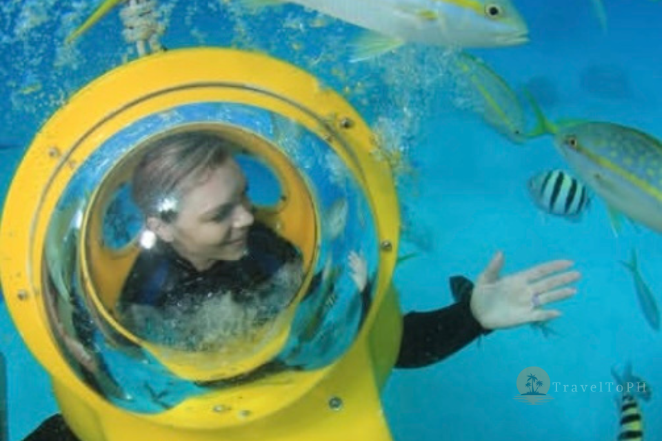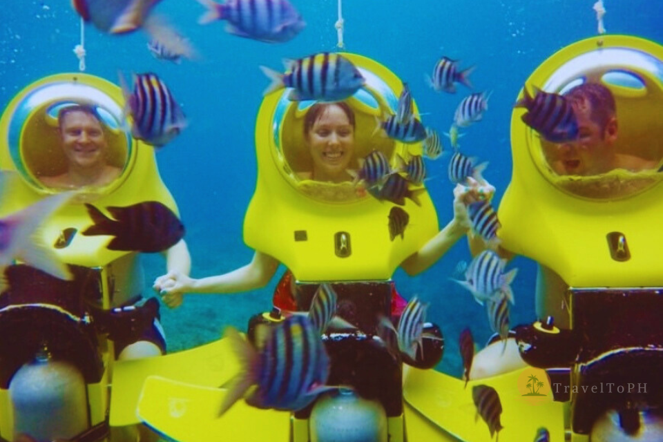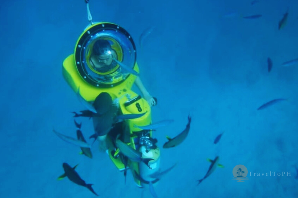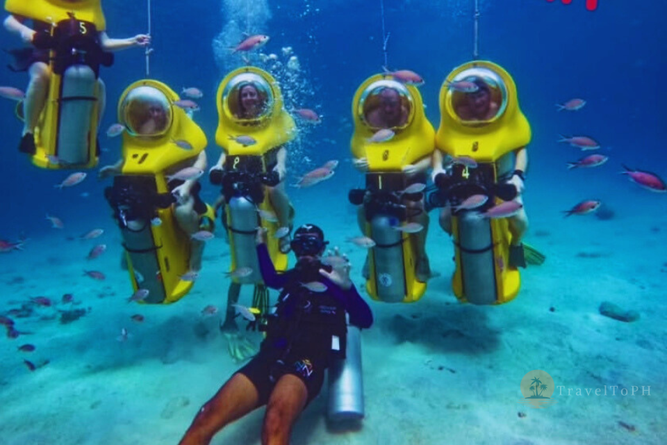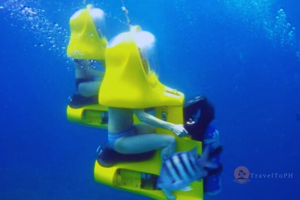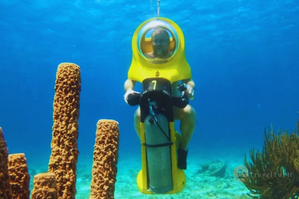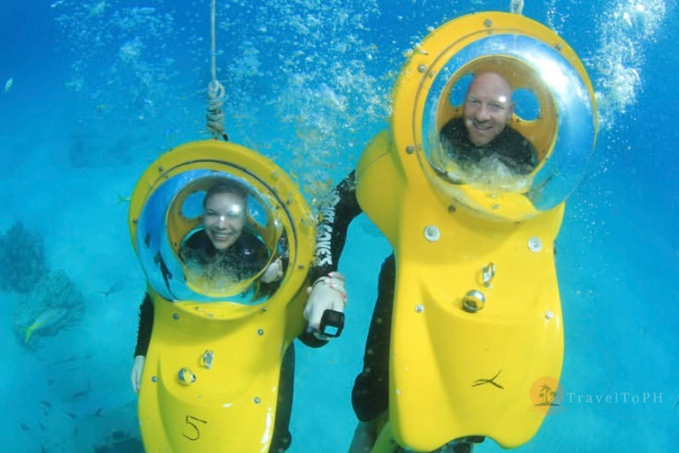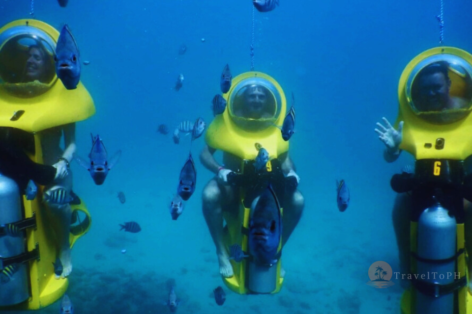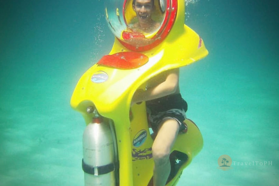 Подводный скутер на острове Боракай — это уникальная возможность исследовать морские глубины, не будучи опытным пловцом или дайвером. Эта активность идеально подходит для тех, кто хочет полюбоваться коралловыми рифами и тропическими рыбами, оставаясь при этом в комфортной среде — внутри прозрачного шлема с подачей воздуха. Вы словно едете на скутере, но по морскому дну! Это невероятно популярное развлечение среди туристов, желающих попробовать что-то новое, не испытывая при этом страха или дискомфорта от воды.
